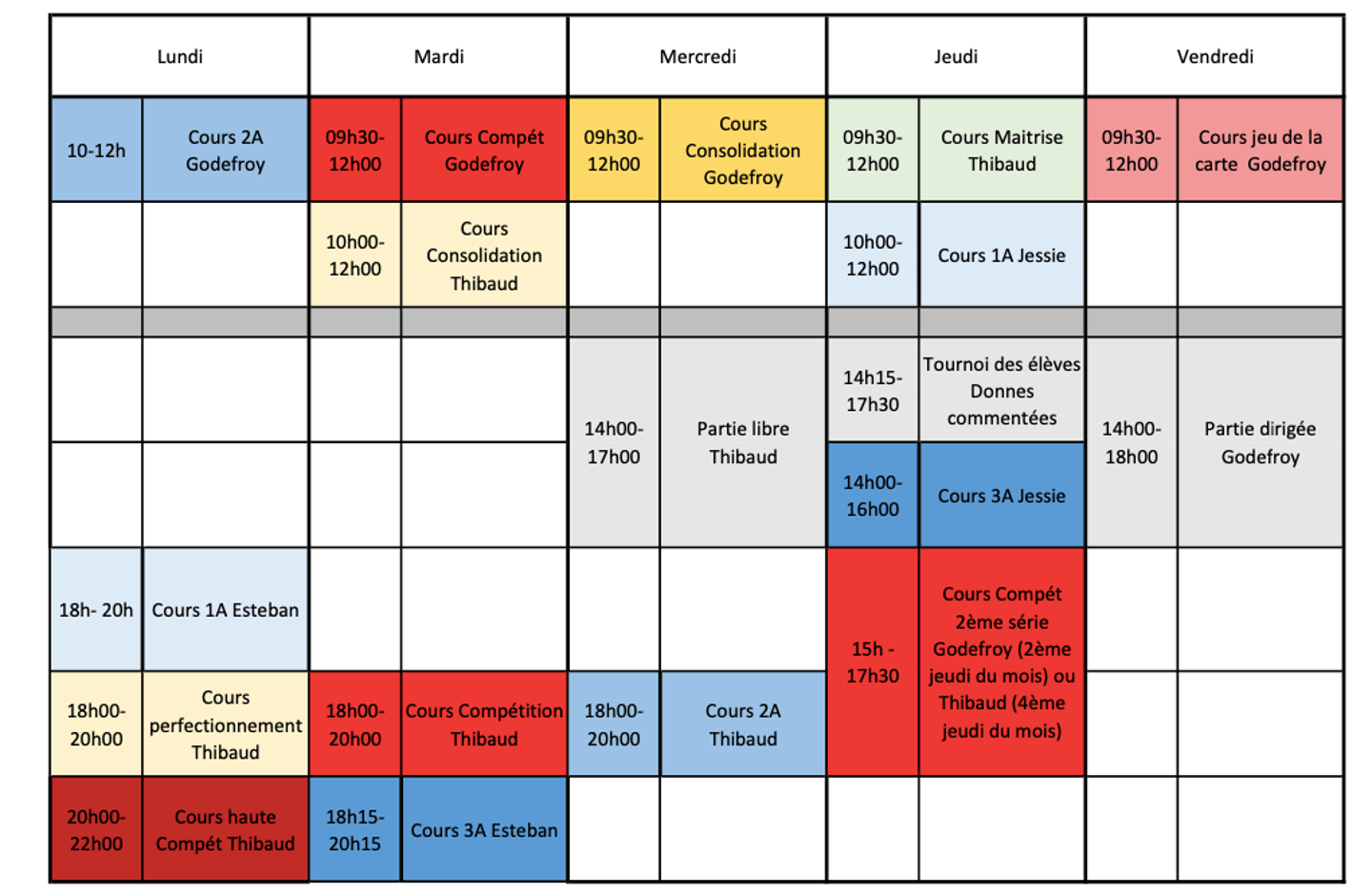 Destiné à ceux qui ont déjà une bonne expérience du jeu et qui veulent avoir une activité régulière afin de garder la maitrise de leurs connaissances. D'expérience, il permet également de clarifier certains sujets pensés être maitrisés ! L'ambiance est excellente, une petite demi-heure de partie libre avant le cours est organisée afin de se réveiller, de prendre le café et de faire connaissance avec les nouveaux.